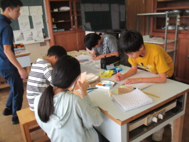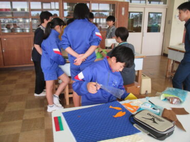 また、6年生は、家庭科の時間にマイバッグづくりに取り組んでいました。先生がミシンをかける様子を見ながら、どのようにミシンを使うか確認したり、どんな模様や飾りを付けるのかを考えたりしていました。