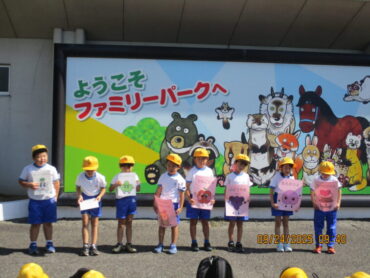 ファミリーパークに到着したら、正門のところで、各学校の学校紹介をしました。大きな声で紹介ができました。