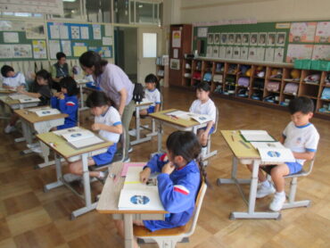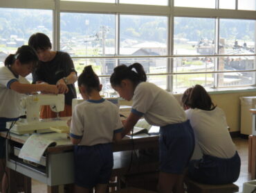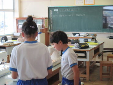 5年生は、家庭科の時間にミシンの使い方について学び、実際にミシンを使って縫う練習をしていました。子供同士で教え合う姿も見られました。