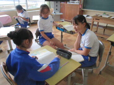 5年生は、国語「たずねびと」の学習でした。学習課題は、「『きれいな川』や『ただの名前』は登場人物にとってどんなものに変わったのだろう」でした。自分で考えたことをグループで話し合い、友達の考えを聞き合っていました。