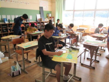 6年生は、図画工作の時間でした。学習発表会に展示する作品の最後の仕上げをしていました。