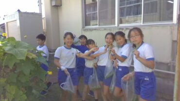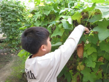 5年生は、理科の学習で育てたインゲンを収穫していました。1学期に理科で発芽の実験や育ち方の学習をした後、一人2苗ずつインゲンを植えました。今年は暑かったこともあり、しっかり実りました。