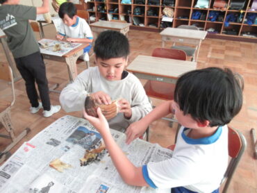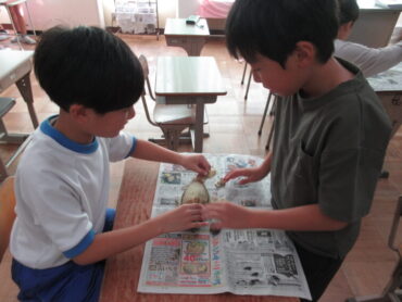 教室で、パリパリと剥がれる皮をむくと、中から黒い種が出てきました。子供たちは、「自分たちが最初に植えた種と同じだ!」「一人2、3個ずつの種から育てた苗を植えただけで、こんなにたくさんの実がなった!」「一つのヘチマにたくさんの種が入っている!」と満足気でした。