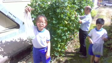 4年生は、昨日(10月1日)、ヘチマの収穫をしました。前回8月27日に収穫したときは、緑の状態のヘチマでしたが、今回は乾いた状態の茶色の状態のヘチマを収穫しました。