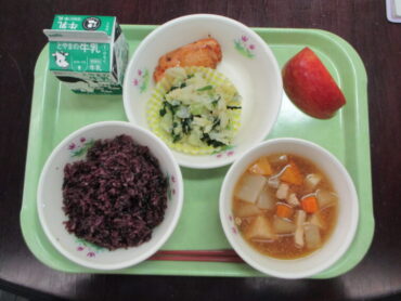 10月3日(金)の給食は、万葉献立でした。メニューは、赤米ごはん、牛乳、鶏肉の香り焼き、ほうれん草のごまびたし、かたかご煮、りんごでした。赤米ごはんにはゆかりが混ぜてあり、いつものご飯とは食感も違い、とてもおいしかったです。一方、子供たちはというと、大人の感覚とは違い郷土料理が苦手な子供が多いようでした。