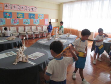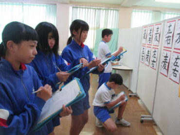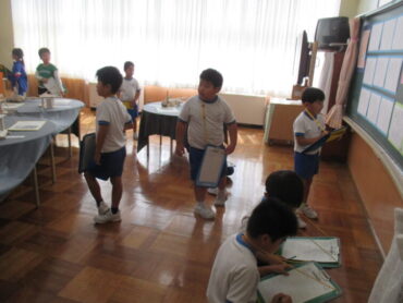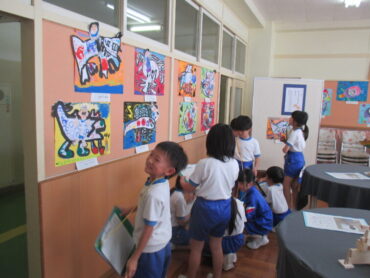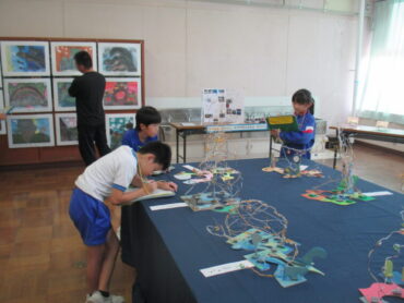 今日、子供たちは、学習発表会で展示された作品をじっくりと鑑賞しました。自分が丁寧に仕上げたように、友達も一生懸命に作品を作ったことを感じながら、作品のよさや自分に取り入れたい点等について鑑賞カードに書き込んでいました。