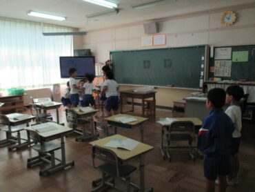 1年生は、国語の時間でした。「くじらぐも」をくじらぐも役と子供役を決めて音読をしていました。