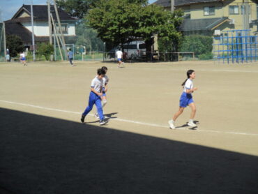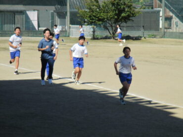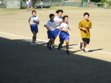 5、6年生は、体育の時間に浜っ子マラソン大会に向けて、10分間走に取り組んでいました。5、6年生は2000mに挑戦します。子供たちが一定のペースで走ることができるように、マラソンを得意とする先生がペースメーカーになってくれました。