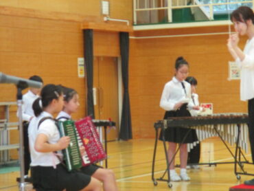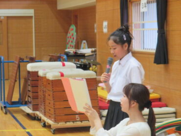 欠席した友達のせりふを急遽覚え、落ち着いて合奏曲を紹介しました。