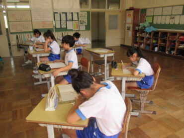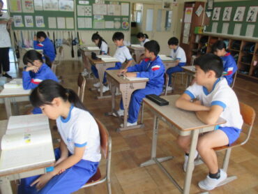 5年生は、算数の時間でした。「大きさの等しい分数のきまりを見つけよう」という課題で学習していました。今後学習する分数の四則計算には、通分や約分等の特有な操作が出てきます。これには、計算力が必要不可欠です。計算力を鍛えるには、まずは習慣的に計算問題を解くことが大切だそうです。子供が計算が苦手だと思っている場合、実は、量をこなしておらず経験値が少ないことが原因の一つにあるようです。毎日10分でも継続的に練習を重ね、計算量を増やすことができると計算力がつくでしょう。小さなことからコツコツと!ですね。