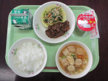 今日の給食は、たかおか食19丼献立でした。メニューは、高岡元気ビビンバ丼、牛乳、かきたま汁、ヨーグルトでした。まずは、ピリ辛に味付けされた肉をご飯にのせて味わい、次に肉にナムルも加えてビビンバ丼として味わい、美味しくいただきました。子供たちも大満足でした。
