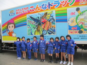 全校の子供たちがトラックを見て、受賞した子供に作品のよさについて声をかけていました。また、トラックの運転席や助手席に乗せていただき、高学年の子供たちもとても喜んでいました。