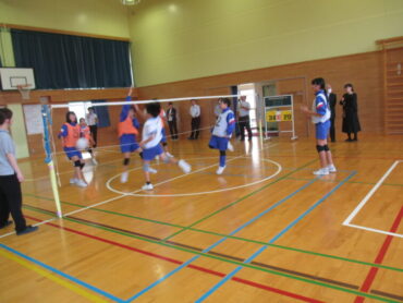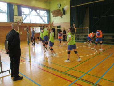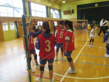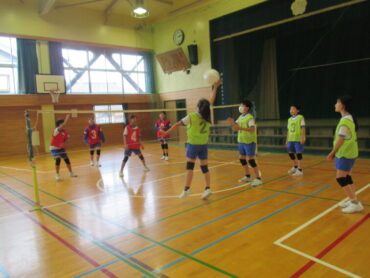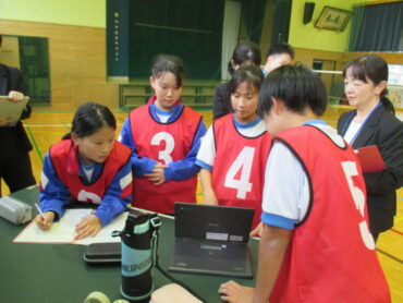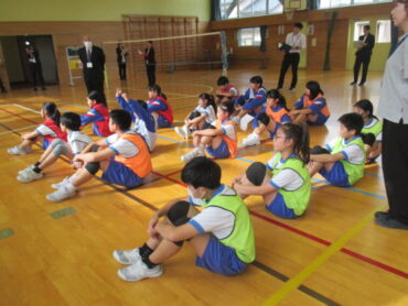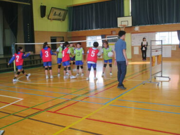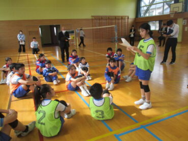 振り返りでは、「苦手な人も楽しくなるように活動できましたか」という先生の問いに5段階の5で楽しかったと答える子供は、「いつもよりもラリーが続いたし、それで点を取ることが多かったからです」「チームで、レシーブやトス、アタック、ブロック等ができたからです」「トスを上げるときに、だれにアタックしてもらうかを考えてあげられたので楽しかったです」という意見や、「サーブやアタックはできたけれど、1回や2回で返してしまうこともあった。レシーブ、トス、アタックと3回続けて返して2点取れた方がよかったから5段階の3です」と自分たちの姿をしっかりと振り返る意見もありました。
