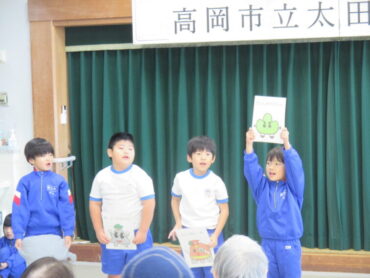 1年生の子供たちは、まず太田小学校のキャラクターを紹介しました。