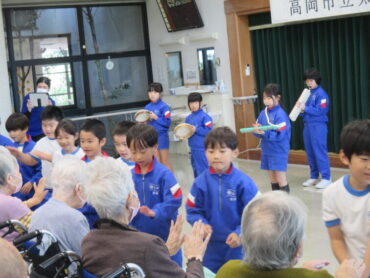 演奏に合わせて、1年生の子供たちが雨晴苑のみなさんとハイタッチをしました。とても喜んでいただけました。