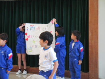 子供たちみんなで書いたメッセージをお渡しして、手を振りながら退場しました。雨晴苑のみなさんは、子供たちの姿が見えなくなるまで、手を振ってくださいました。
