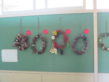 1年生の教室前を通ったら、生活科で作ったリースが飾ってありました。
