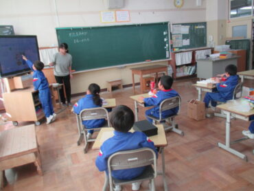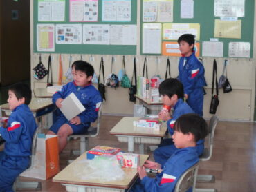 1年生は、算数の時間でした。家から持ってきたたくさんの箱の形について、共通点や相違点を見付けていました。