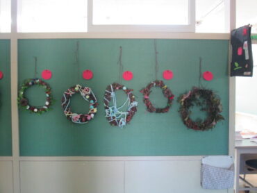 1年生の教室前を通ったら、生活科で作ったリースが飾ってありました。