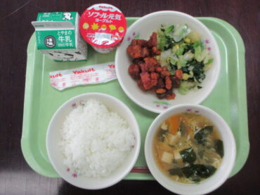 ごはん、牛乳、豚肉と大豆のケチャップがらめ、青菜のコーンあえ、かきたまスープ、ヨーグルト
