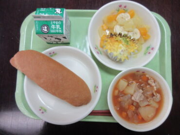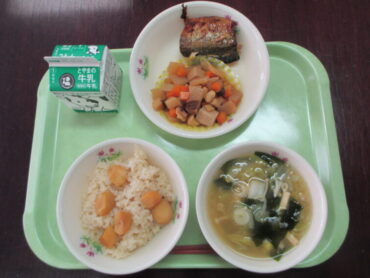 ごはん、牛乳、わかさぎの南蛮づけ、しそごまあえ、高岡の煮しめ