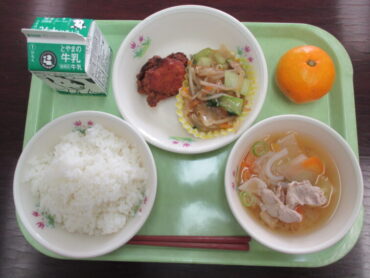 ごはん、牛乳、鶏肉の米粉揚げ、野菜炒め、さつま汁、みかん