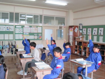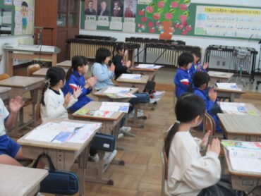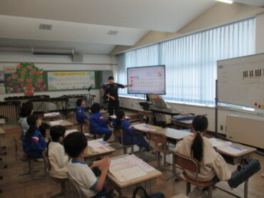 2年生は、音楽の時間でした。3拍子の拍に合わせて「膝・手・手」とたたいていました。「いるかは ざんぶらこ」の曲に合わせてリズムをたたき、3拍子を感じていました。