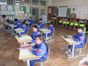 1年生は、国語の時間でした。「じどう車くらべ」の学習で、「はしご車」について、その仕事とそのためにどのようなつくりになっているのかについて文章を読み進めていました。