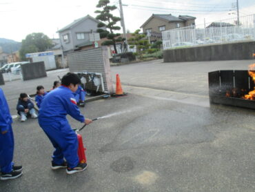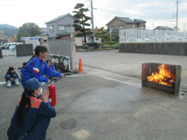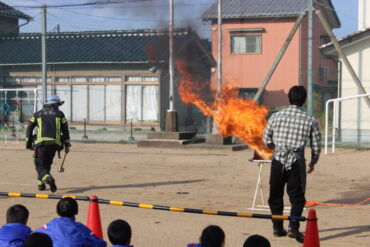最後にグラウンドで燃焼実験を見せていただきました。子供たちは興味津々な様子で、実験を見ていました。揚げ物等をするときは火からを離れないことや、高温になったサラダ油から火が出た場合に水をかけるとダメだということがよく分かりました。