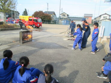最後にグラウンドで燃焼実験を見せていただきました。子供たちは興味津々な様子で、実験を見ていました。揚げ物等をするときは火からを離れないことや、高温になったサラダ油から火が出た場合に水をかけるとダメだということがよく分かりました。