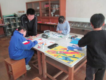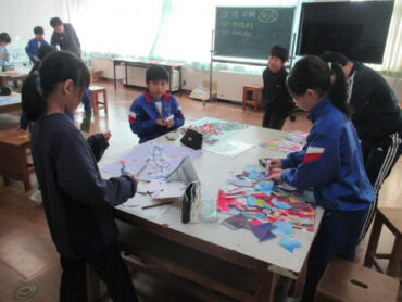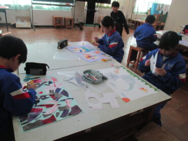 4年生は、図画工作「はる はる はる絵」の学習でした。以前、ローラーを使って画用紙にいろいろと表現したものを見て、形や色、組み合わせから表したいことを考えて貼り進めていました。子供たちそれぞれに表したいイメージがあり、思い思いに表現していました。
