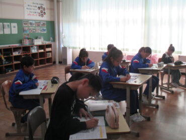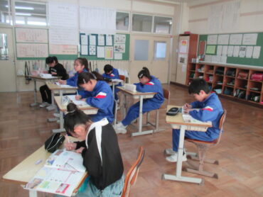6年生は、算数の時間でした。比例の2つのグラフを比べて読み取り方について学習していました。縦軸、横軸どちらで比べるのか考えていました。