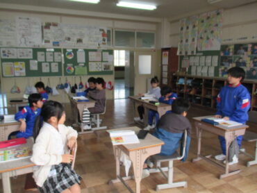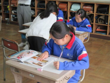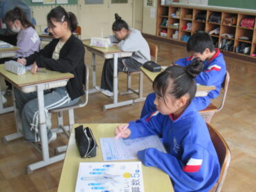 5年生は、算数の時間でした。「単位量あたりの大きさ」の学習でした。混み具合や採れ具合、人口密度等、苦手な子供が多い単元です。また、問題には、「四捨五入して上から2桁の概数で比べましょう」など既習事項も入ってきます。知識や計算等の技能が身に付いていないとどんどん難しくなります。だからこそ、低学年から継続的に計算量を確保していきたいものです。
