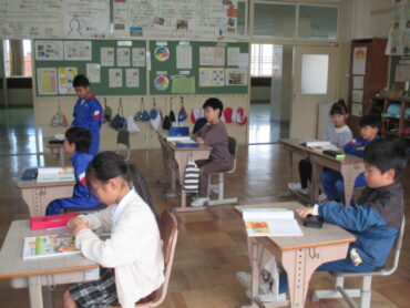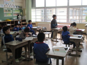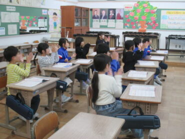 2年生は、音楽の時間でした。「山のポルカ」に合わせてリズムを打っていました。8分音符や8分休符がまざって、少し難しいリズムでした。しかし、少し難し方が子供たちが真剣になっていました。