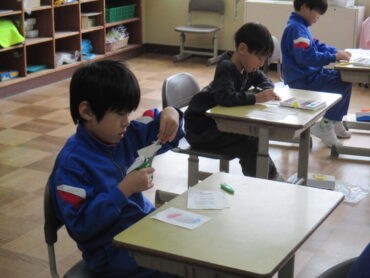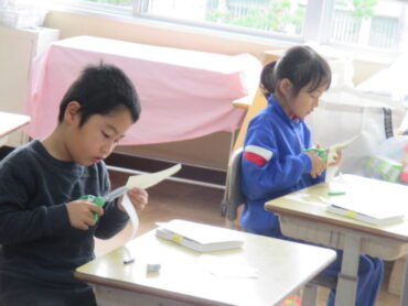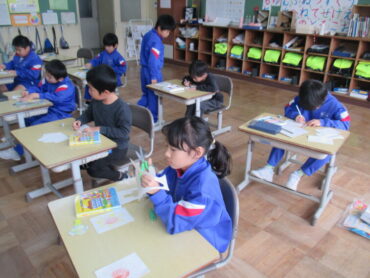 1年生は、図画工作の時間でした。「うきうきボックス」貼る絵を4つかいて、はさみで切っていました。