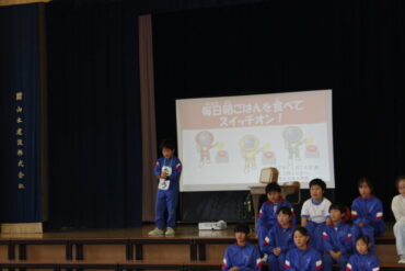 11月14日(金)、学校保健委員会を開催しました。今年度のテーマは「毎日朝ごはんを食べて、スイッチオン!」でした。朝ごはんの大切さについて、からだ委員会の子供たちが劇仕立ての発表をしました。この日のために一生懸命練習を重ね、成果を発揮することができました。学校医の先生からも専門的な視点からお話をしていただきました。