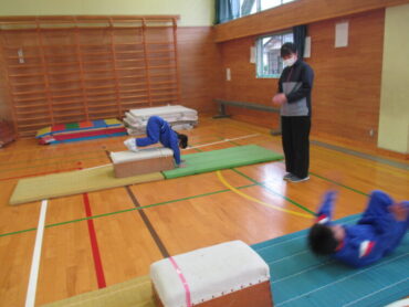 いよいよ跳び箱の上で前転をしました。跳び箱の狭さや硬さを怖く感じる子供もいましたが、台上前転がさらりとできた子供もいました。