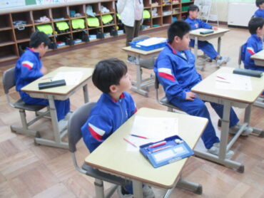 2年生は、図画工作の時間でした。カッターの使い方を学習していました。直線や波線、図形の切り取りなどをしながら、カッターの扱い方に慣れていました。