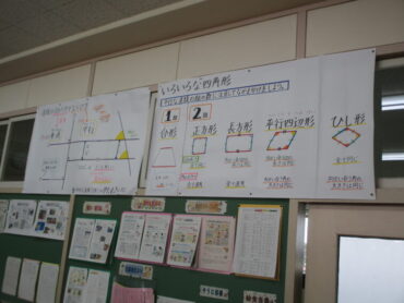4年生は、算数の時間でした。これまで、いろいろな四角形について、辺の長さや角の大きさ、平行な直線の組の数等を学習してきました。掲示物を確認しながら復習し、今日は対角線について学習していました。