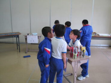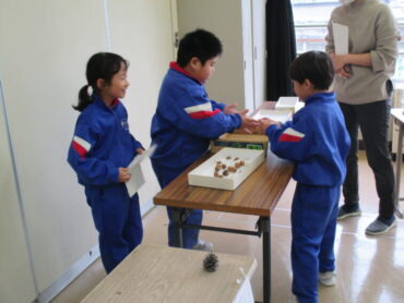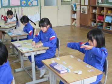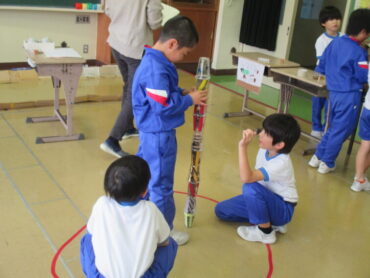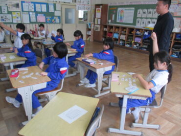 1年生は、生活科の時間でした。明日、2年生や保育園の年長さんと一緒に活動する「おいもパーティー」の際に、焼く時間を利用して、「秋のおもちゃあそび」に招待する予定だそうです。まずは、自分たちでそれぞれのコーナーを楽しんでいました。遊び方を説明したり、コツを教えたりしていました。明日、みんなに喜んでもらえるといいですね。