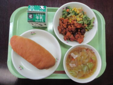 コッペパン、牛乳、豚肉とレバーのケチャップがらめ、ブロッコリーサラダ、きゃべつのもちもちスープ