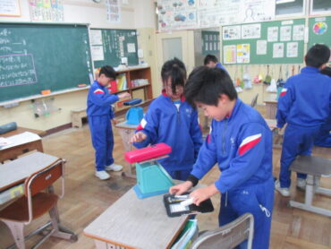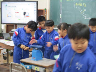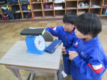 3年生も算数の時間でした。「はかりを使って、重さを調べよう」と自分と友達の筆箱を測っていました。①平らなところに置く②はかりが0をさすように調整する③めもりは正面からよむという3つのポイントを意識して、測っていました。