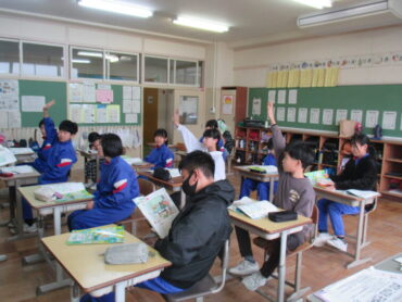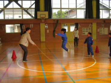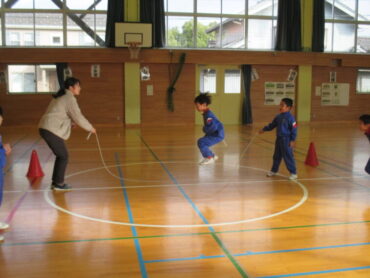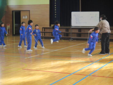 1、2年生は、体育の時間でした。大縄跳びに挑戦していました。周りの子供たちが「はい!はい!」と入るタイミングを声かけしながら、スムーズに跳べるように練習していました。