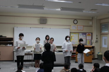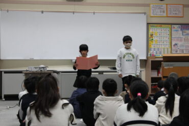 また、全校児童を代表して、2年生と4年生の子供が2学期に頑張ったことを発表しました。キーボー島やかけ算九九を頑張ってレベルアップする楽しみを感じていること、学習発表会に向けて休み時間や家でも音楽練習を頑張ったこと、挨拶ビンゴを通して相手が笑顔になる喜びを味わい、3学期からも挨拶を頑張りたいと感じていることなどを話しました。