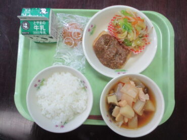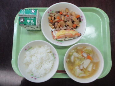 ご飯、牛乳、鮭のマヨネーズ焼き、五目豆、高岡野菜のあったか汁