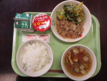 ご飯、牛乳、豚肉としらたきのピリ辛炒め、即席づけ、団子汁、ヨーグルト