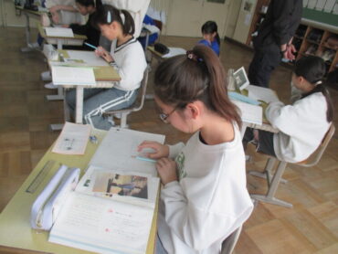 5年生は、国語「言葉でスケッチ」の学習でした。読む人に情景が伝わるように、表現を工夫して文章を書く学習です。一人一人に封筒が渡され、中には違う写真が入っていました。まず、人物(動物)の様子、見て分かること、想像したこと、周りの様子の4つの視点にそってメモに書きだし、写真から想像したことが読む人に伝わるように表現を工夫して書きました。どんな仕上がりになったのでしょうか。