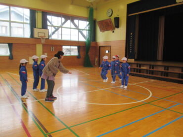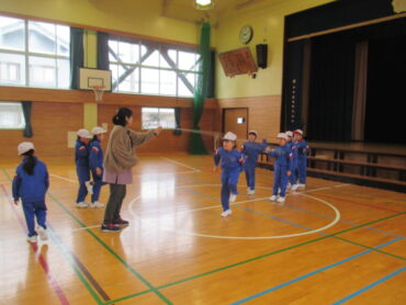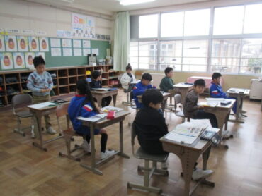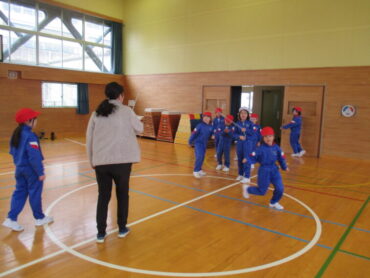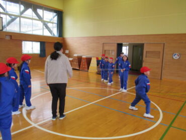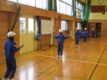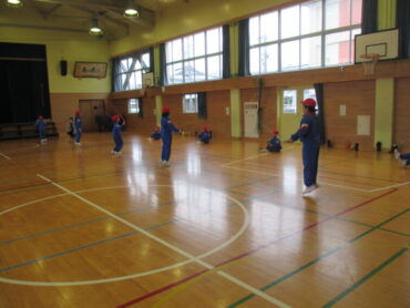 1、2年生は、体育の時間でした。縄跳びの練習の後、色団ごとに大縄跳びの練習をしていました。寒い体育館の中に、元気な子供たちの声が響いていました。