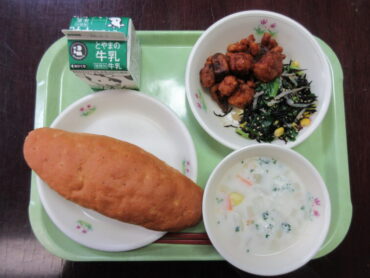 カルシウムが豊富な牛乳は、毎日給食に配膳されます。今日のスープには牛乳が入っています。ビタミンⅮが豊富な鮭と一緒にとることで、カルシウムの吸収がよくなります。