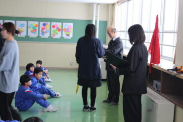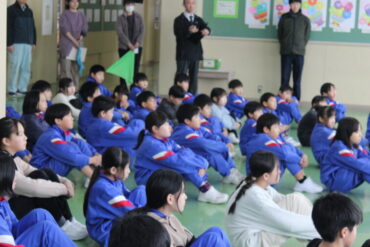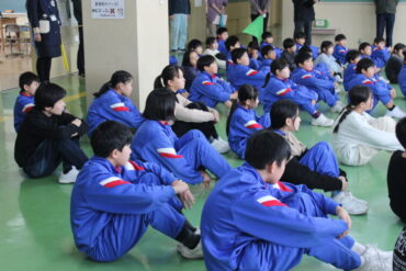 学校長が「先生の指示を聞いて行動できましたか」と問いかけると、子供たちは全員が手を挙げていました。また、学校では“先生の指示をよく聞いて行動すること”、そして学校の外では「いかのおすし」をしっかり守ること等、自分の命を自分で守ることの大切さについてお話がありました。